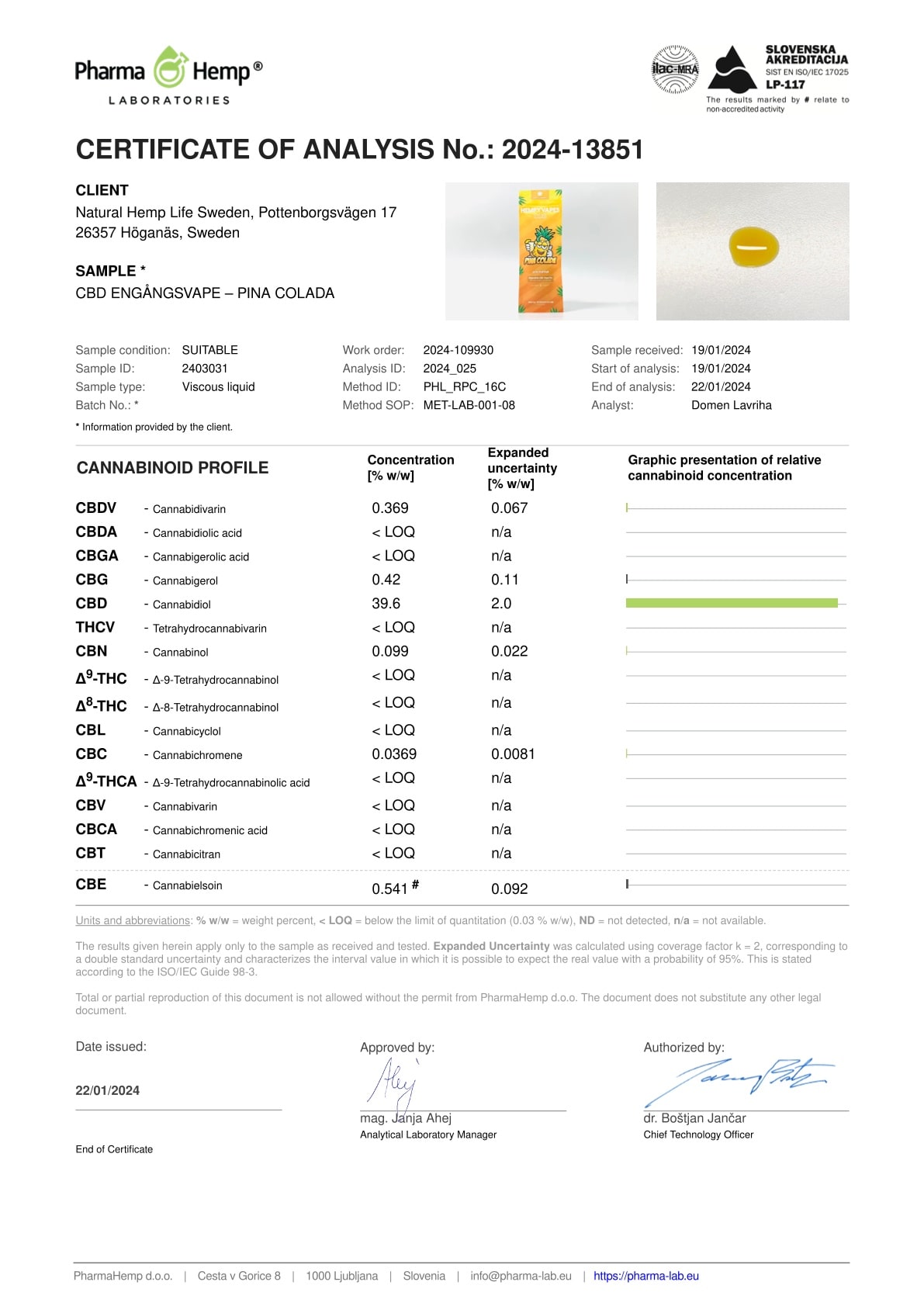 Pina Colada kombinerer eksotiske smaker av ananas, kokos og furu. Enheten leveres med et fullt oppladet batteri og er klar til bruk med én gang. Med et innhold på over 80 % CBD og en naturlig terpenprofil lover vi en opplevelse i verdensklasse.